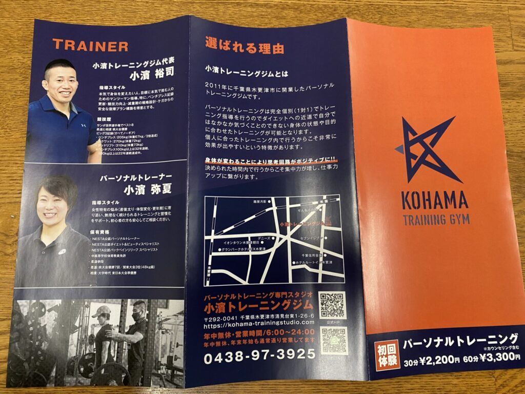 新しいパンフレットが完成しました!ぜひお手に取ってください 投稿日 2026年1月19日 著者 小濱 裕司 カテゴリー 小濱トレーニングジム 以前作成したパンフレットがなくなったため、 今回あらためてデザインも作り直しました! 夫婦ふたりともセンスがないので(笑)、今回も全てお任せでお願いし、 いくつか案を出していただいた中から選ばせていただきました。 いつも本当にありがとうございます。 パンフレットの中身も、 初めて来られる方はもちろん、ご紹介でお渡しする場合でも より分かりやすく、読みやすい内容になっております。 皆様ぜひお手に取ってご覧いただけたら嬉しいです♪ パンフレット パーソナルトレーニング パーソナルトレーニングジム 小濱トレーニングジム 木更津